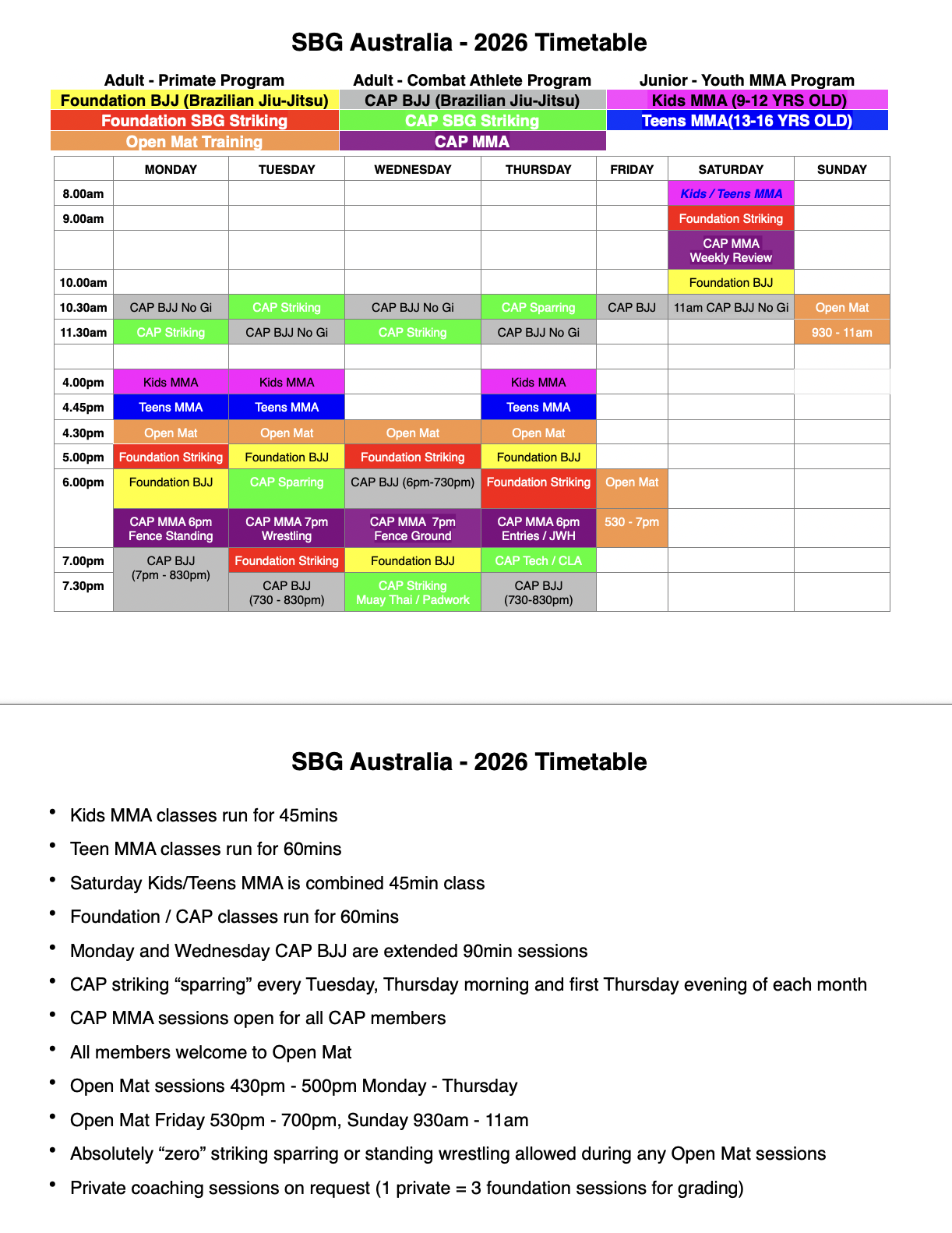 For more detailed information about the above timetable and the best program for you to get started on your mixed martial arts journey please click the free trial button at the top right of this page.